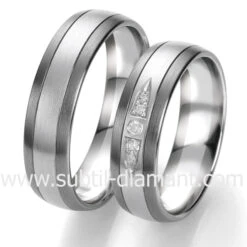 Alliance prestige en or 14 ou 18 carats. Cette alliance a une particularité d’avoir une partie en ruthenium (alliage platine)conférant à cette alliance un côté moderne avec cette couleur contrastante du noir.