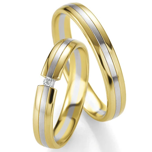 Alliance ornée d’un diamant taille brillant entre les deux ors.