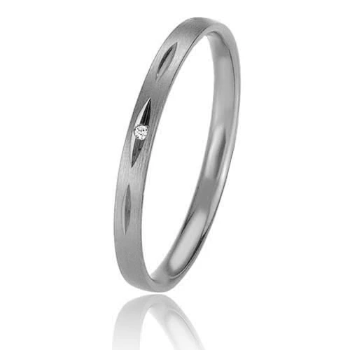 Alliance sertie d’un diamant taille brillant dans une fente en forme de losange.