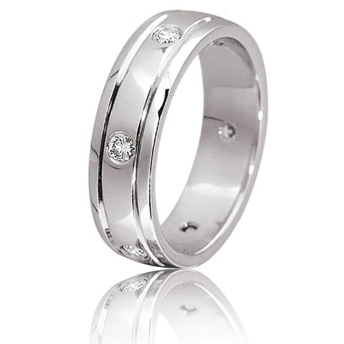 Alliance « Capella » en or blanc 18 carats composée d’un anneau central serti de 0,30 carat de diamants en tour complet, mis en valeur par un sillon circulaire de chaque côté.