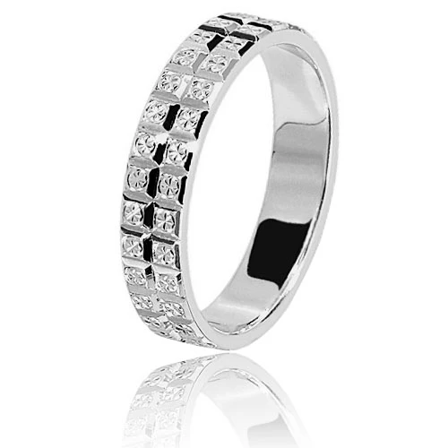 Large de 4 mm l’alliance est lapidée sur une rangée avec des motifs en forme de carré de chocolat diamanté.