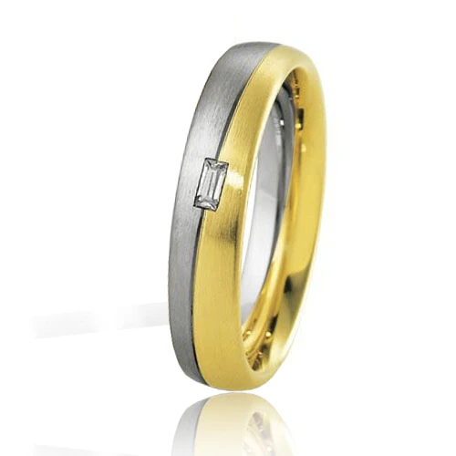 Un diamant taille émeraude de 0.06 carat est serti au centre de l’alliance entre l’or blanc et jaune.