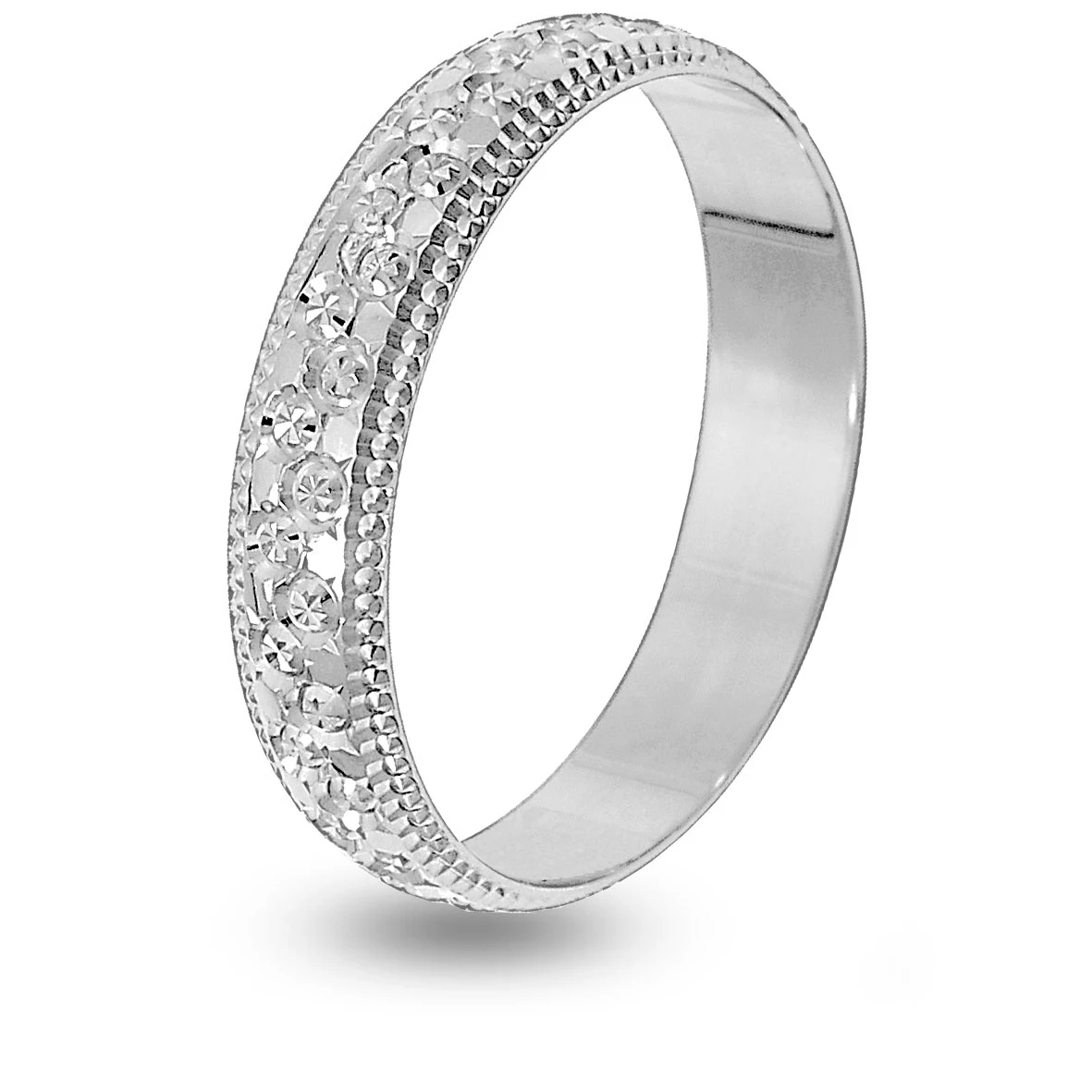 L’alliance de 4 mm de large a une multitude de ronds facettés donnant un aspect diamanté à la bague.