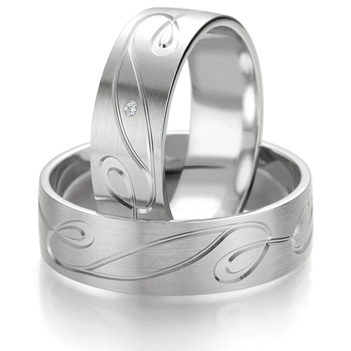 Cette élégante alliance en platine sertie d’un diamant est une création de la maison Breuning.