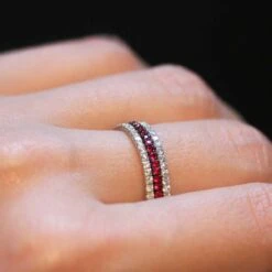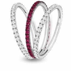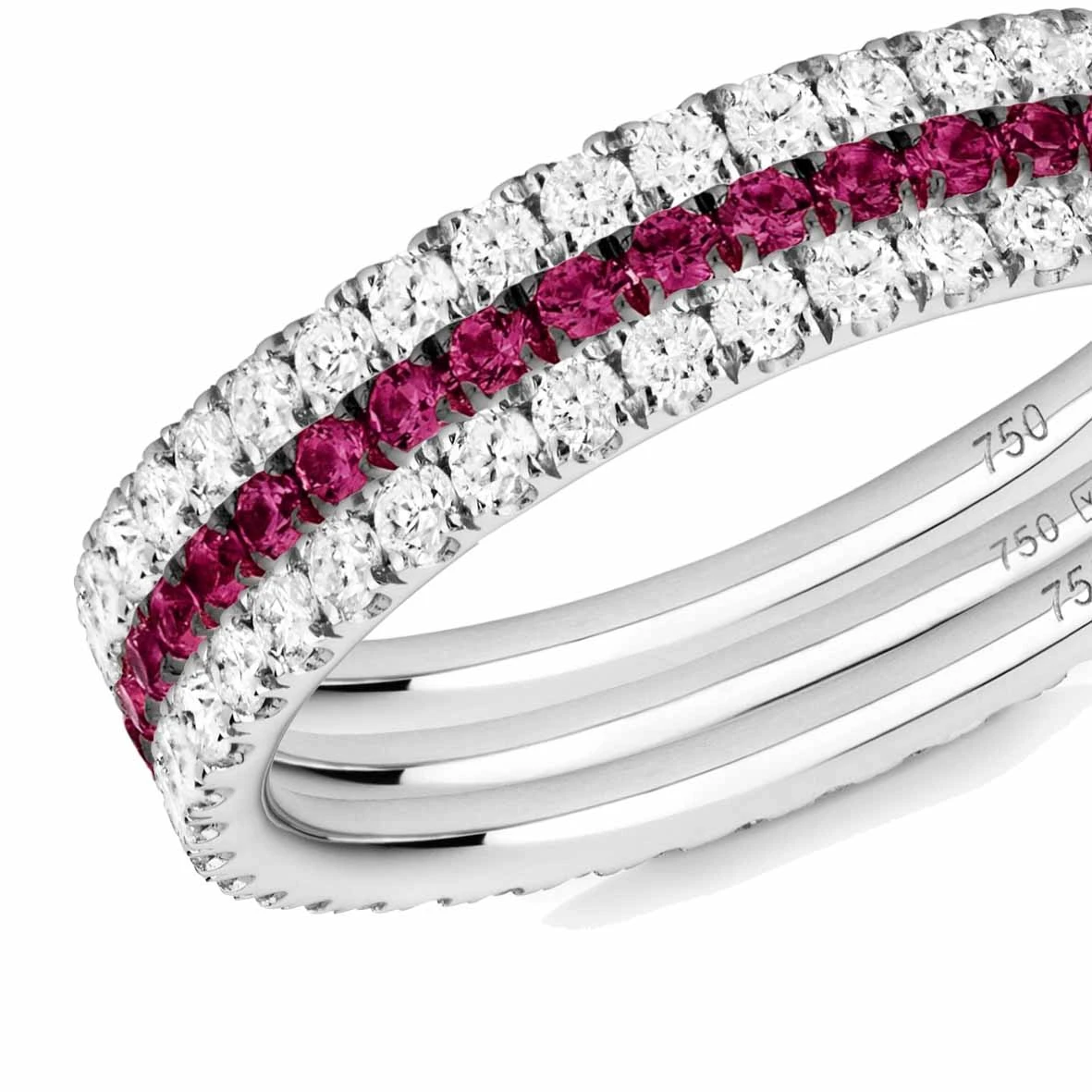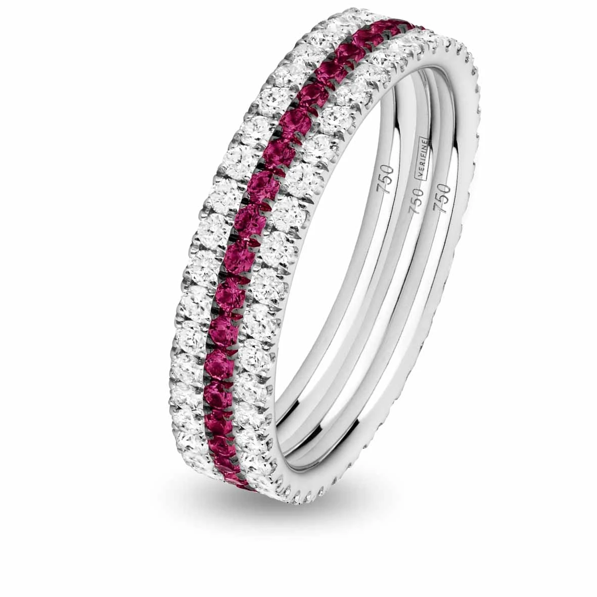 La marque Verifine vous propose cette magnifique triple alliance en or blanc de 18 carats sertie de diamants blancs et de rubis