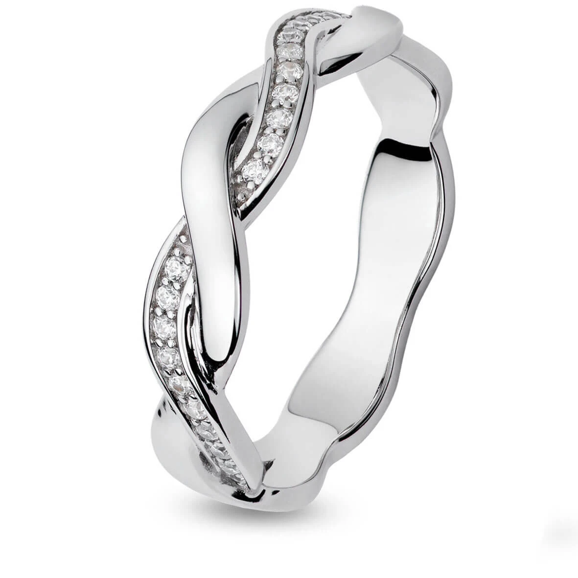 Bague en or blanc montée avec deux fils qui s’entrelacent dont un est serti de 0.10 ct de diamants.