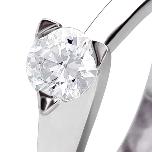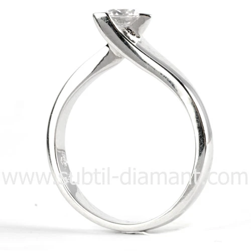 Sa monture moderne et assymétrique met en valeur le diamant qui est serti sur trois griffes. Sa couleur et sa pureté est de G-VS1 .