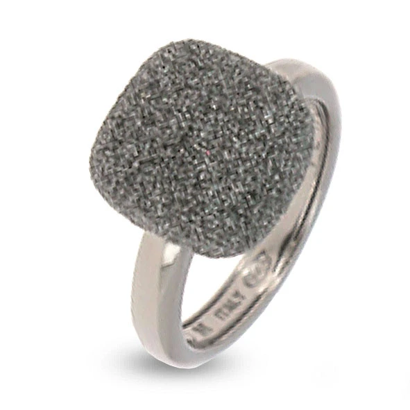 Le corps de la bague est en argent de couleur rose avec une partie supérieur de forme carré bombé revêtue carbone de synthèse et émail transparent de couleur gris