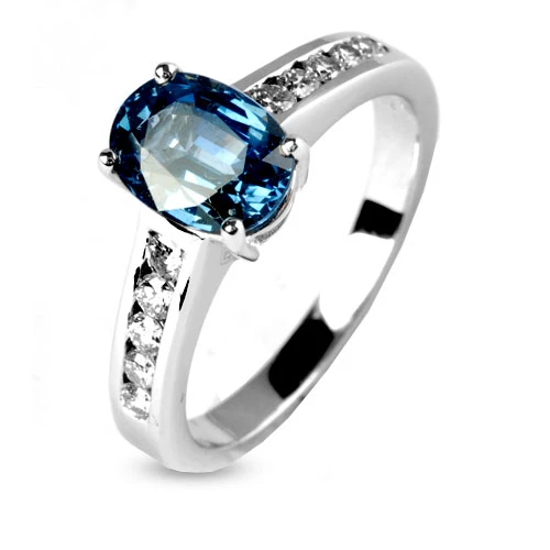 Le saphir de forme ovale est épaulé par un serti rail de dix diamants. Pavage diamants de 10 diamants pour un poids de 0.30 ct. La couleur des diamants est G (extra blanc).
