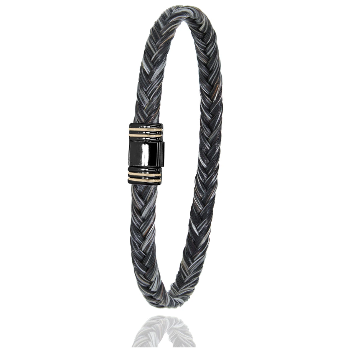 Bracelet Albanu en crin de cheval, avec un fermoir en acier inoxydable avec revêtement PVD noir et or jaune.