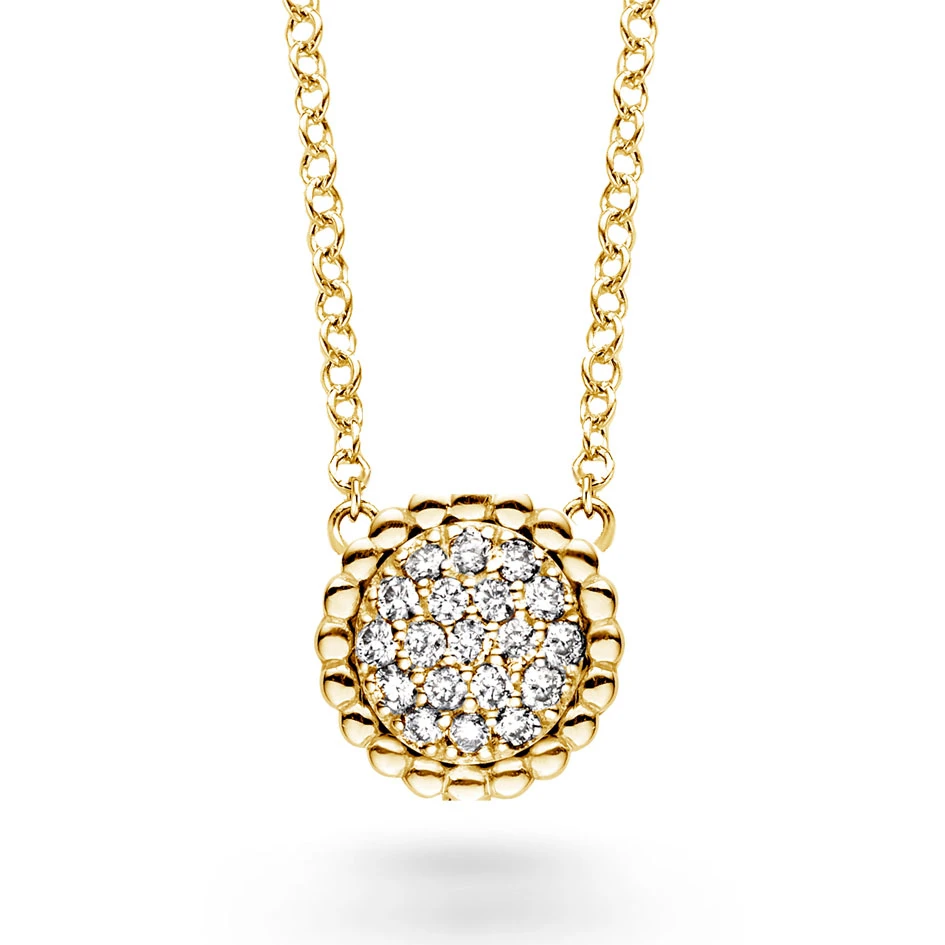 Les diamants du pendentif sont entouré de motifs ronds en or jaune à l’aspect poli.