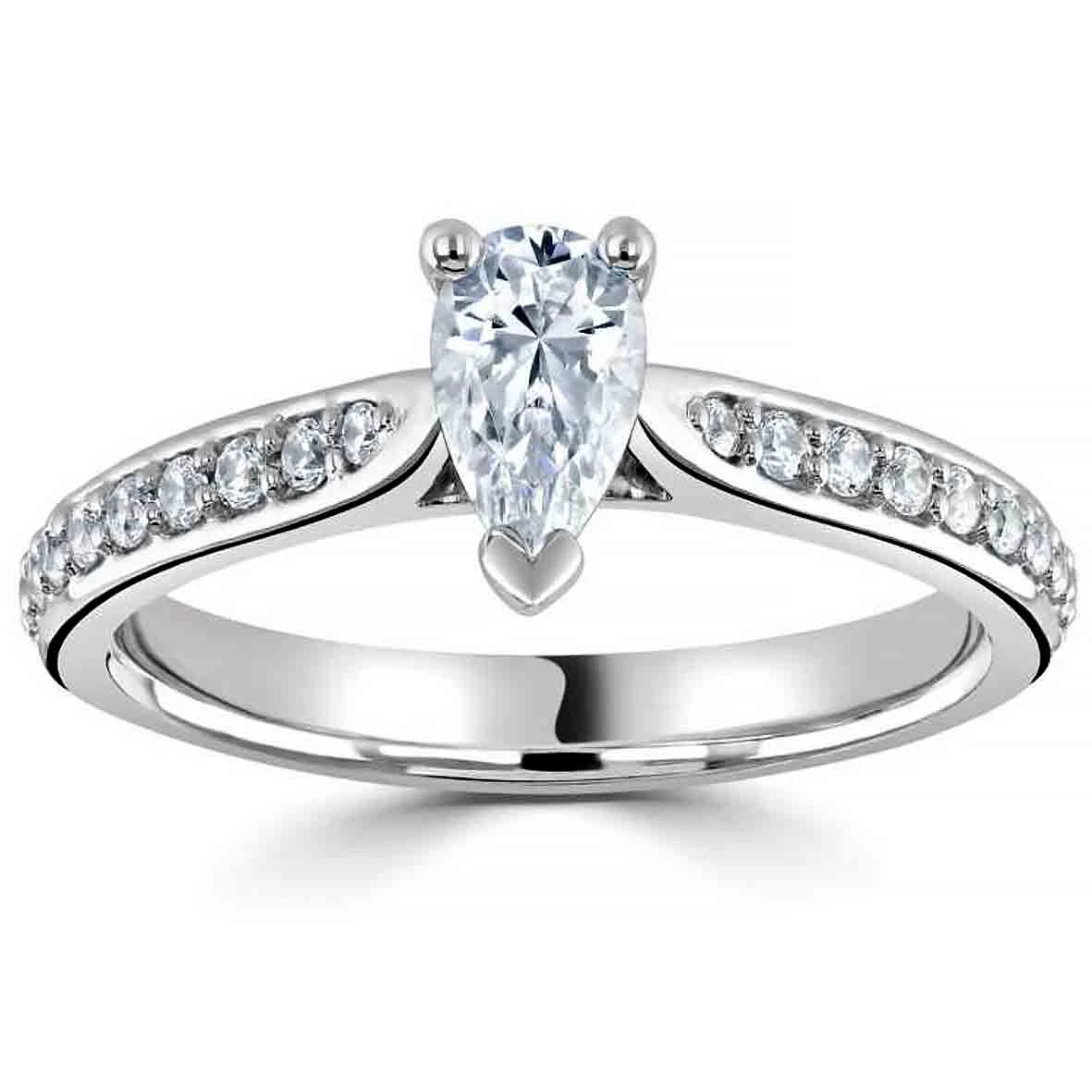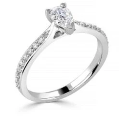 Cette bague au corps légèrement bombé serti de diamants vient se marier avec un diamant taille poire serti par 3 griffes.