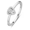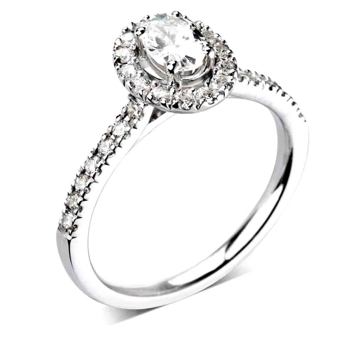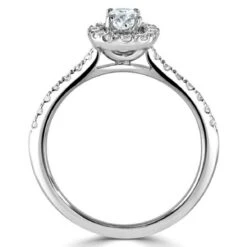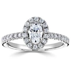 Le diamant de centre serti par des griffes. Un entourage de diamants ronds permet de donner une grande impression de brillance