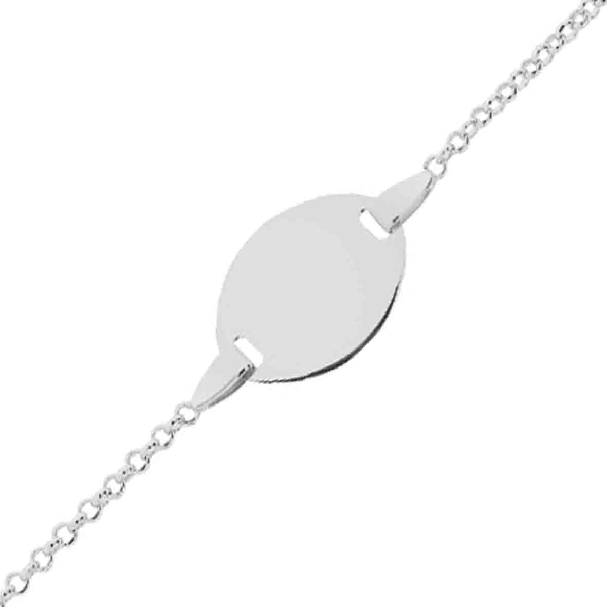 La plaque ovale bordée de cette gourmette est dotée de deux attaches triangulaires au bout, ajoutant une touche d’élégance à son design unique.