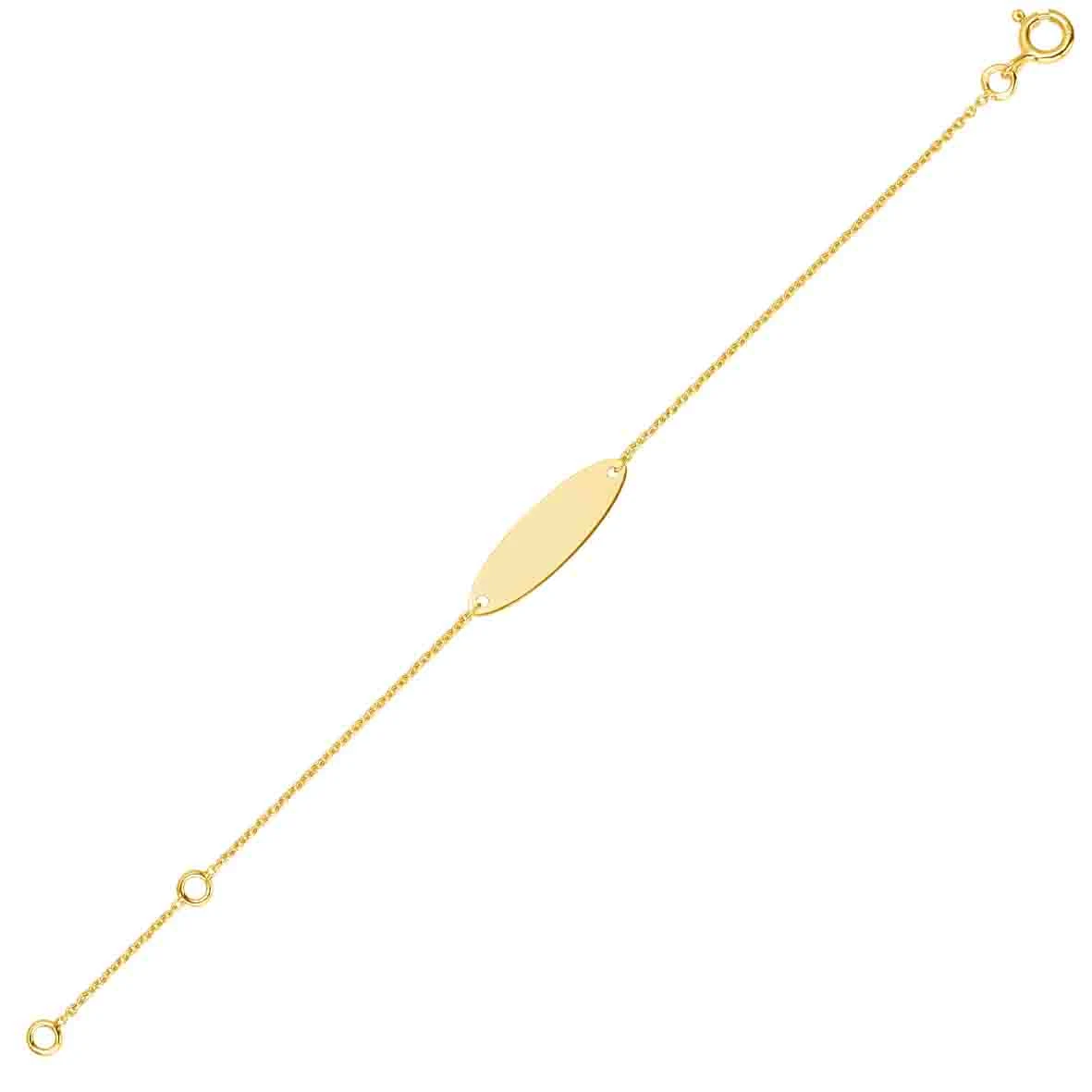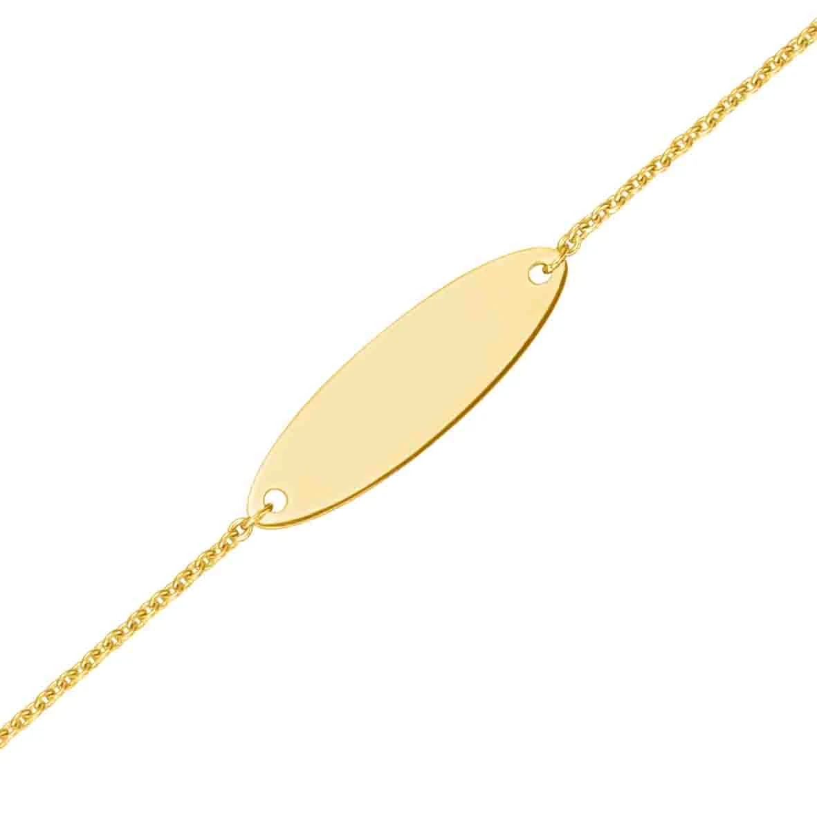 La plaque en forme de tonneau ajoute une touche d’originalité et de charme à cette gourmette pour bébé en or jaune.