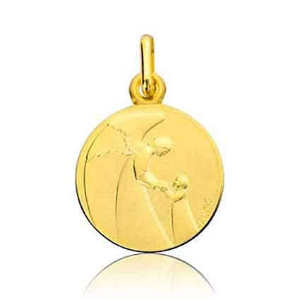 Cette médaille de forme ronde est en or jaune 18 carats avec une finition satinée.
