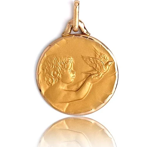 Cette médaille en or jaune polie satiné représente un ange une colombe dans ses mains, message de paix.
