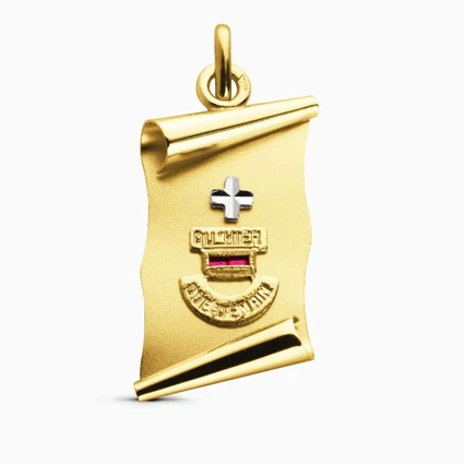 Cette médaille de forme parchemin en Or Jaune 18 carats a une finition satinée.