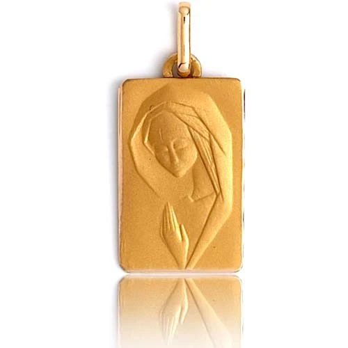 Gravure épurée pour cette médaille rectangulaire représentant une vierge en position de prière.