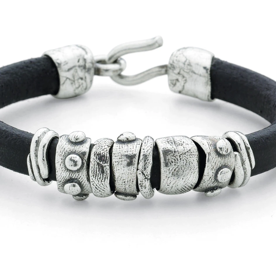 Bracelet épais Noir dont le centre est constitué de plusieurs breloques argent.