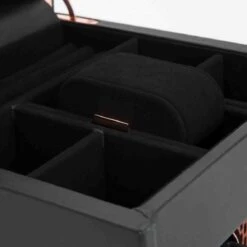 Comprend un placage métallique personnalisé, un intérieur en micro suède, un couvercle en verre verrouillable, un écran LCD rétroéclairé, un revêtement en poudre ou une plaque finie en cuivre, 3 anneaux, 4 petits compartiments, 1 rangement pour montre avec manchette surélevée et un seul module d’enroulement.